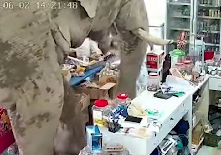 В социальных сетях опубликовали видео, снятое в Таиланде. В один из магазинов неожиданно ворвался гигантский слон. Сотрудники в панике выбежали на улицу. На кадрах также видно, как мужчины пытается отпугнуть животное, судя по всему, стреляя в него из рогатки.