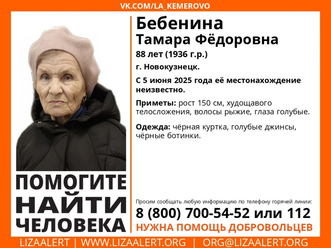 ПСО "ЛизаАлерт" в официальном сообществе "ВКонтакте" сообщил о начале поисков 88-летней жительницы Новокузнецка. Бебенина Тамара Федоровна не выходит на связь с близкими с 5 июня, ее местонахождение неизвестно.