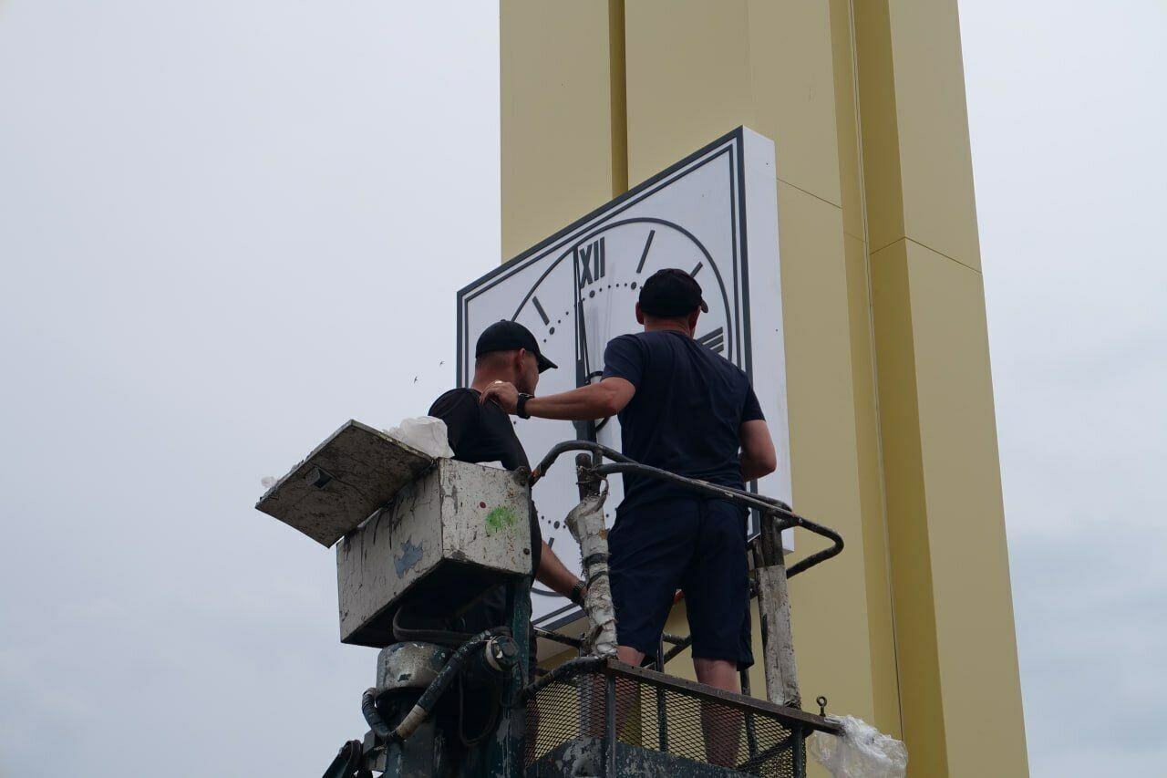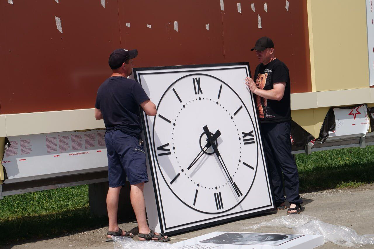 В первую июньскую пятницу рабочие начали монтировать часы. Как отметил градоначальник, один циферблат будет направлен в сторону Дворца культуры имени 50-летия Октября, а второй – в сторону аллеи. С него монтаж и начался.
