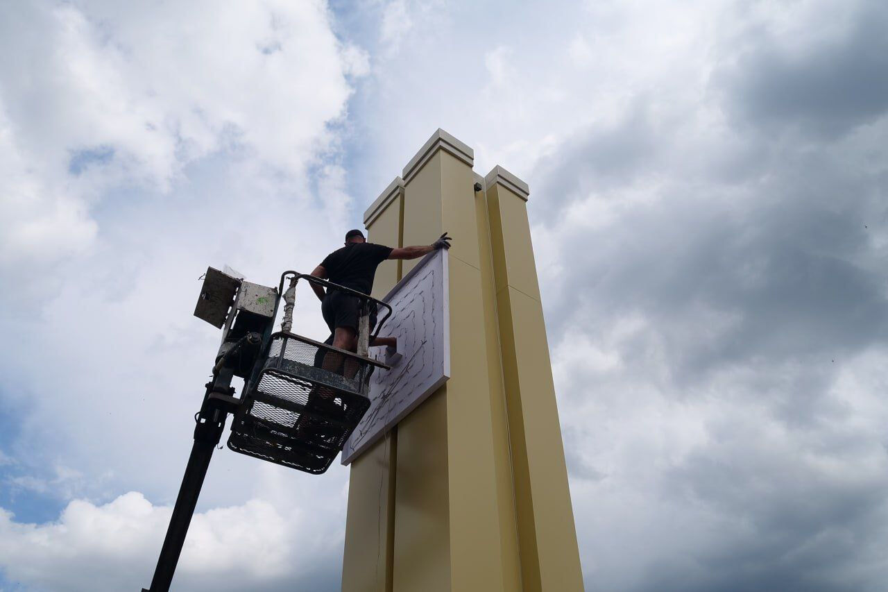 Также завершается оформление доски почета: рабочие устанавливают на нее световые короба и вешают портреты.