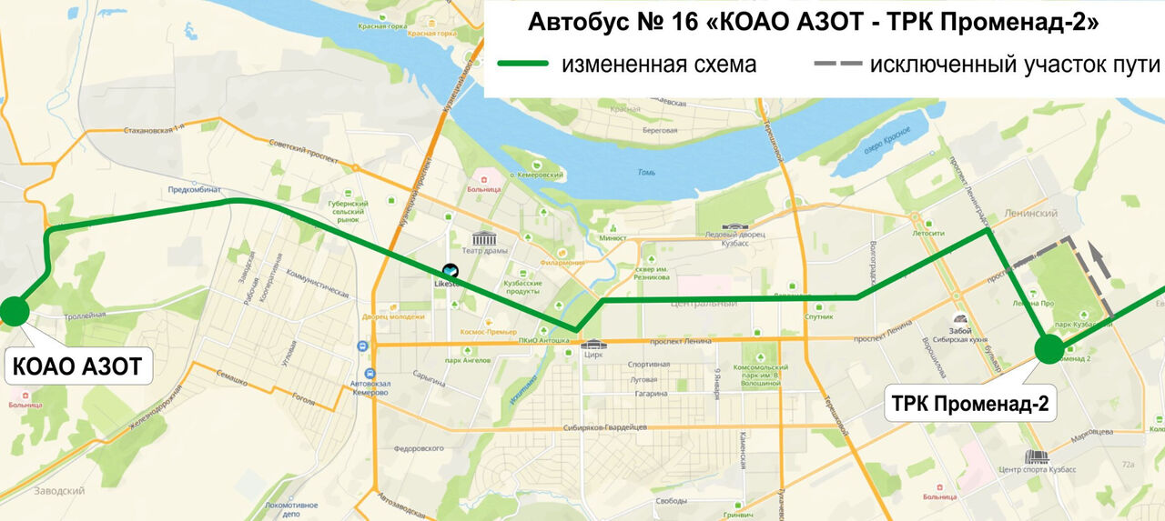 Маршрут № 16 "КОАО Азот – ТРК Променад 2" будет следующим: проспект Октябрьский, проспект Ленинградский, остановка "ТРК Променад 2", проспект Химиков, остановка № 1.