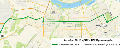 Маршрут № 19 "ДСК – ТРК Променад 2" будет курсировать по проспекту Ленина, проспекту Ленинградскому, проспекту Химиков, до остановки № 1.