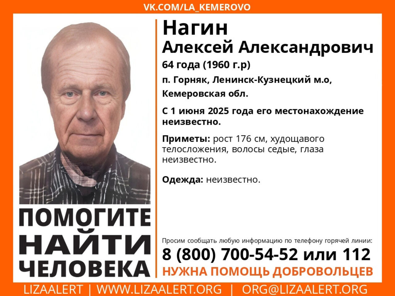 ПСО "ЛизаАлерт" сообщил о пропаже 64-летнего жителя поселка Горняк Ленинск-Кузнецкого округа. Местонахождение Нагина Алексея Александровича остается неизвестным с воскресенья, 1 июня.