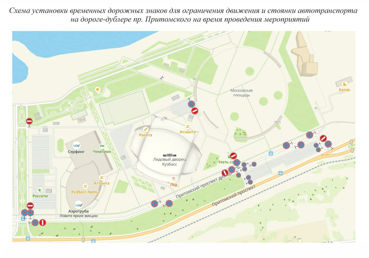 - По проезду вдоль СК "Кузбасс-Арена" от дублера проспекта Притомского до поворота на набережную;