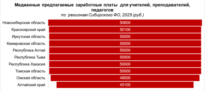Медианная зарплатных предложений для учителей в Кузбассе находится на уровне 50 000 рублей. При этом более высокие заработные платы предлагают педагогам Новосибирской области (50 600 рублей) и Красноярском крае (50 100 рублей), а в Омской области и Алтайском крае они ниже – 49 000 рублей и 45 100 рублей соответственно.