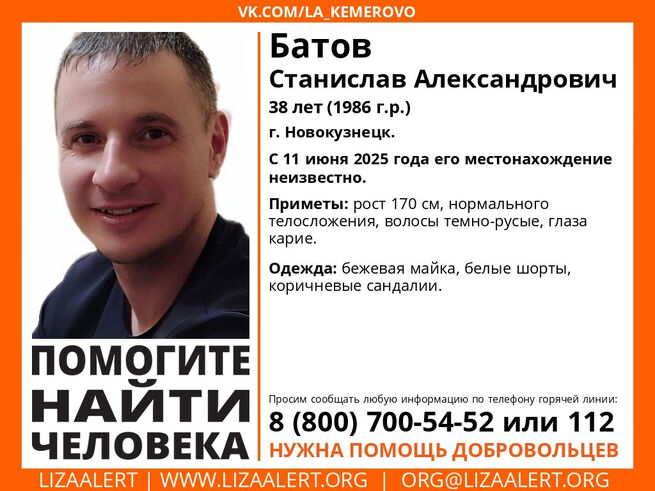 Поисково-спасательный отряд "ЛизаАлерт" объявил о пропаже Станислава Александровича Батова, 38-летнего жителя Новокузнецка. С 11 июня его местонахождение неизвестно.