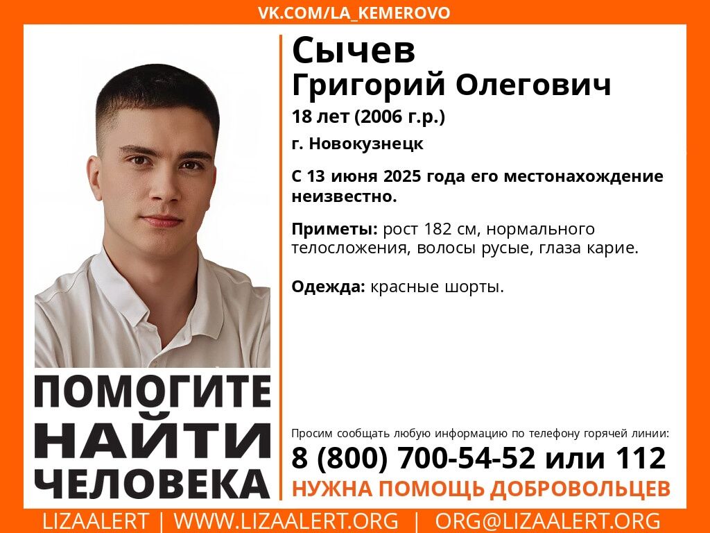 Так, в Новокузнецке пропал 18-летний Сычев Григорий Олегович. Волонтеры ПСО "ЛизаАлерт" сообщили, что местонахождение юноши остается неизвестным с 13 июня.