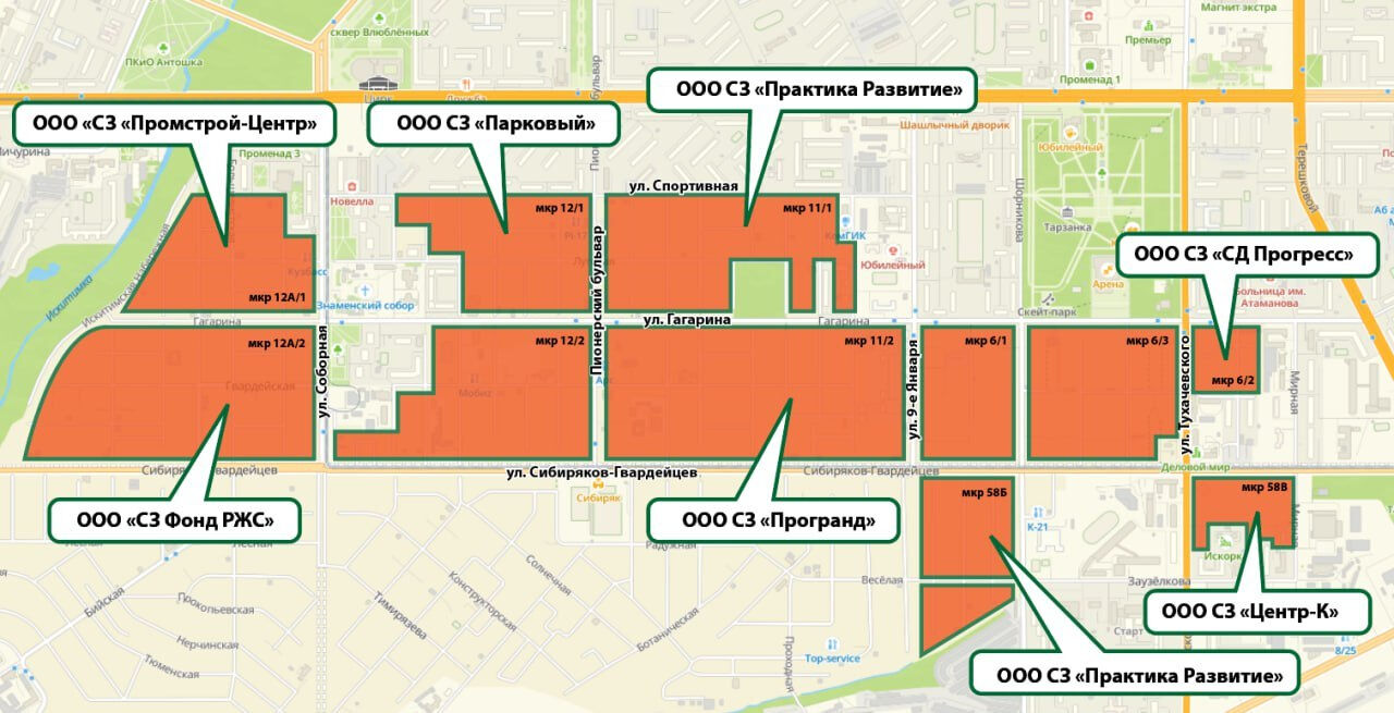 - микрорайоны 11/1 площадью 15,88 га и 58Б площадью 8,9 га – ООО СЗ "Практика Развитие".