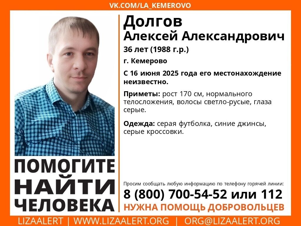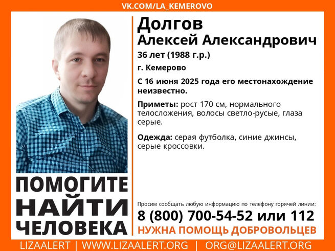 ПСО "ЛизаАлерт" сообщил о пропаже 36-летнего жителя Кемерова. Местонахождение Долгова Алексея Александровича остается неизвестным с понедельника, 16 июня.