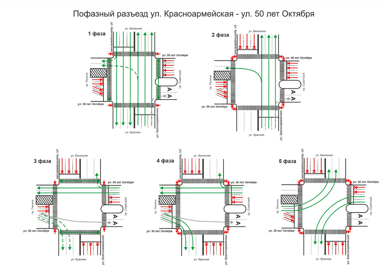 – Добавится фаза, отсекающая транспорт по ул. Красноармейской со стороны ул. Весенней для выполнения безопасного поворота налево на ул. 50 лет Октября при движении от ул. Красной, – сказали в мэрии.