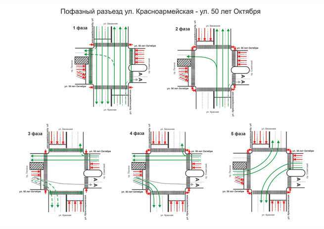 • первая – транспорт по улице Красноармейской и пешеходы через улицу 50 лет Октября;