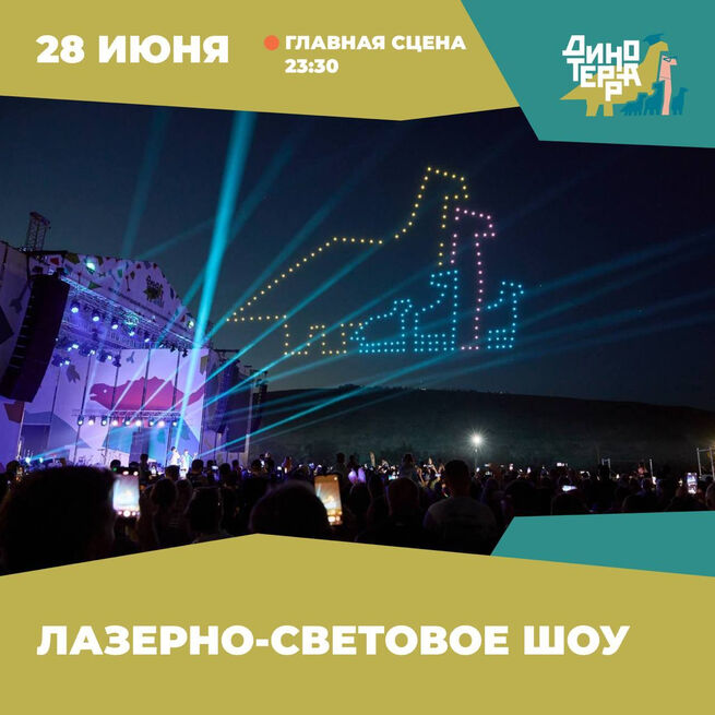 В субботу, 28 июня, на "Динотерре" после завершения флешмоба "Передай привет в космос" у главной сцены в 23:30 пройдет лазерно-световое шоу. Гости фестиваля увидят в ночном небе анимированного пситтакозавра и его прогулку по сибирским просторам.