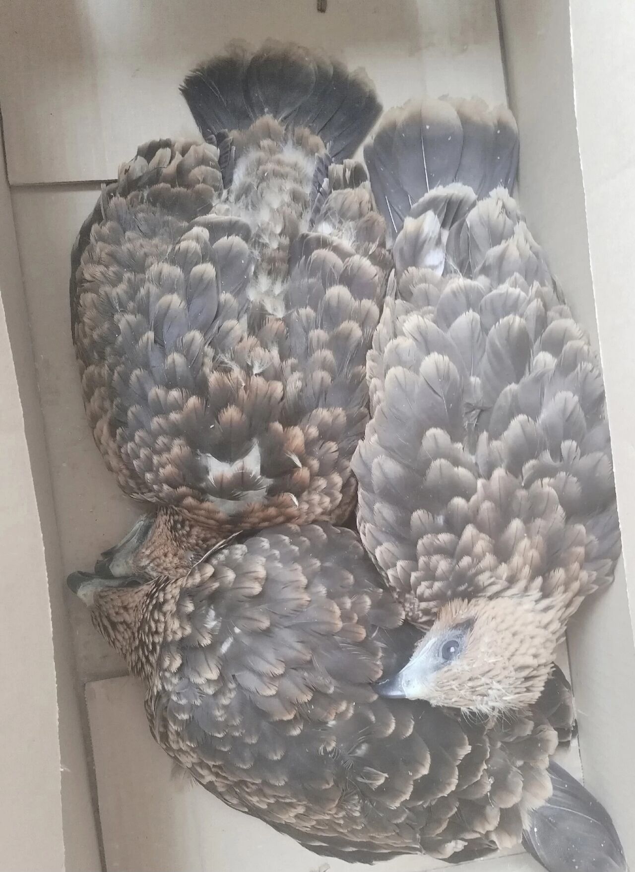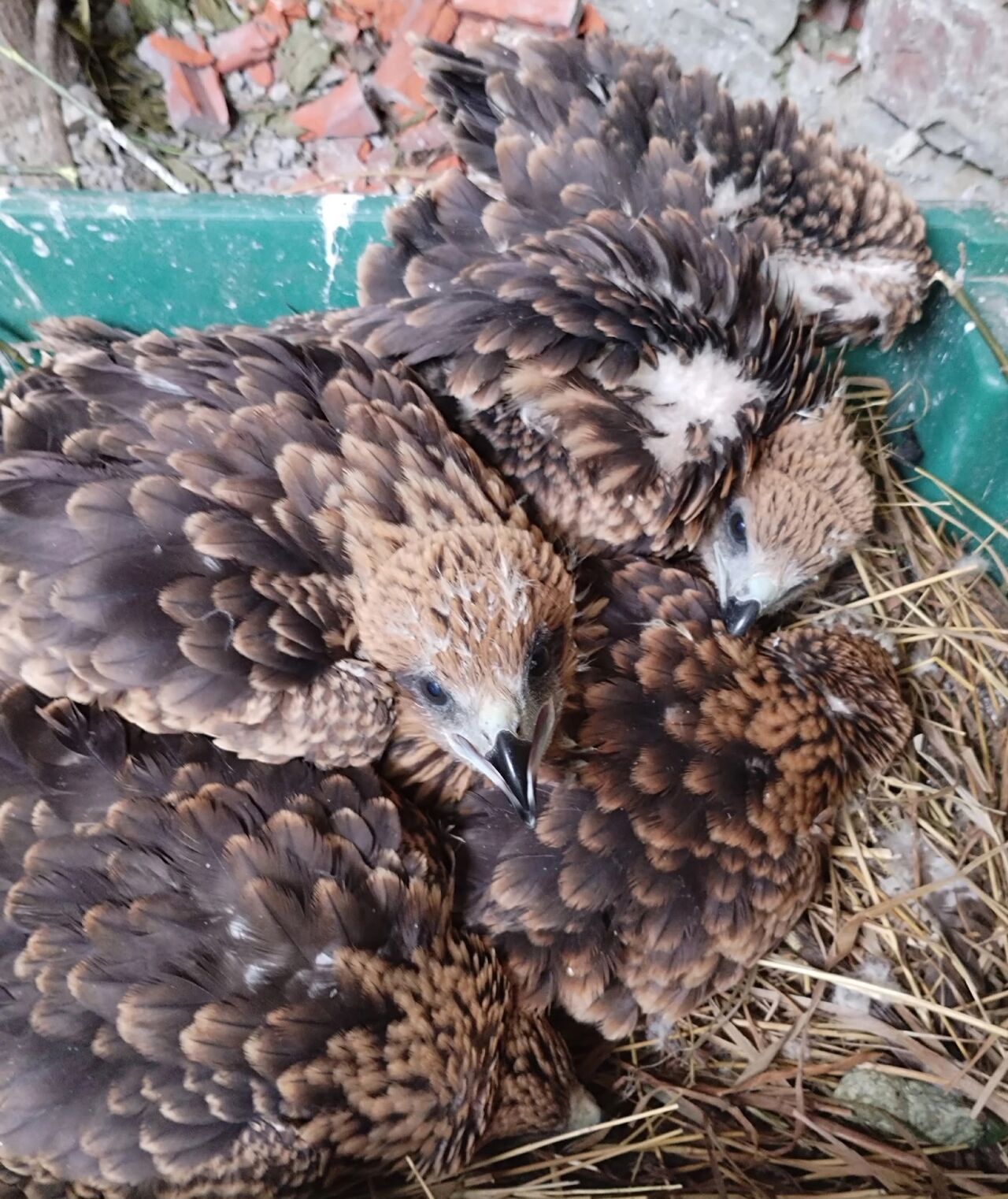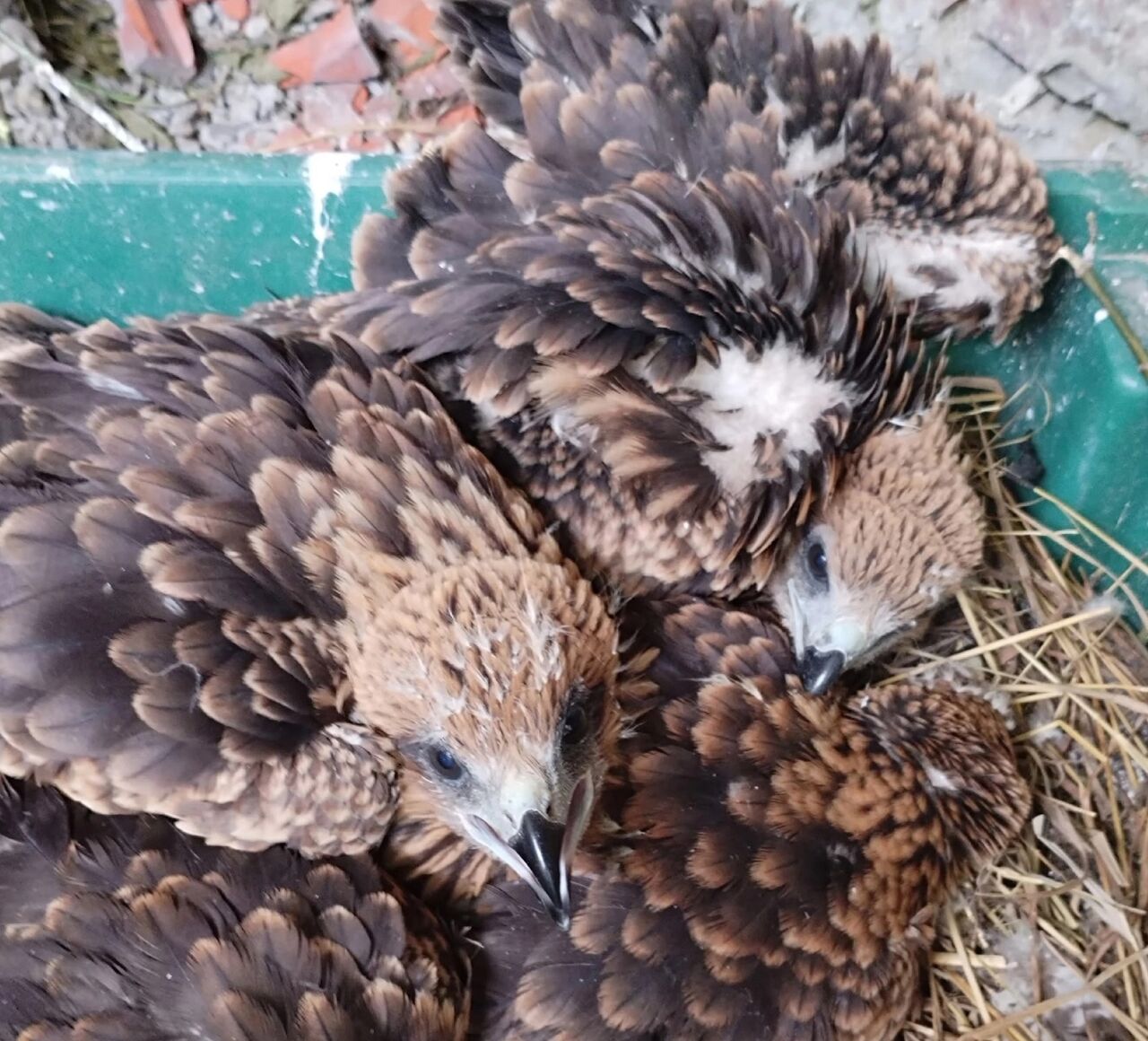 Пернатых сироток доставили в центр, где поместили к уже имевшемуся птенцу коршуна, теперь их четверо.