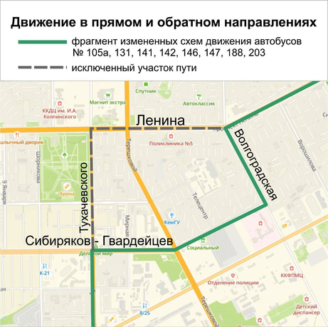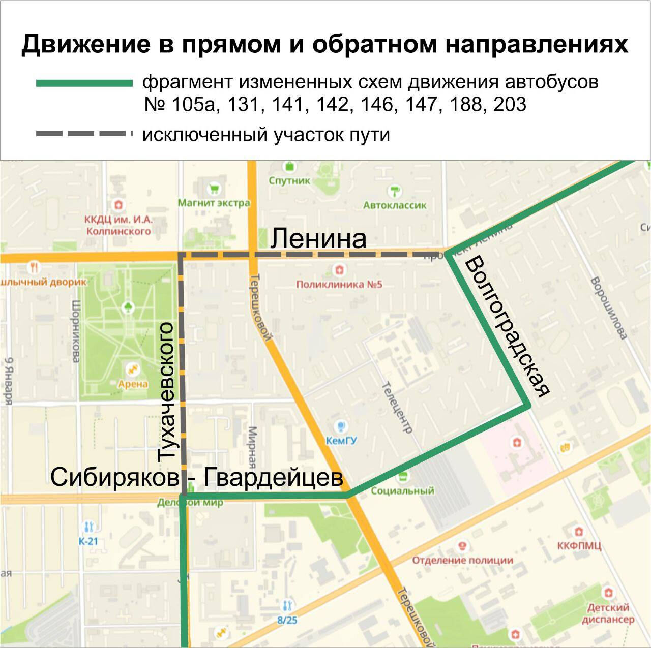 Автобусы № 105а, 131, 141, 142, 146, 147, 188, 203 в прямом и обратном направлениях будут ехать следующим образом: проспект Ленина – улица Волгоградская – улица Сибиряков-Гвардейцев – Тухачевского и далее по маршруту.