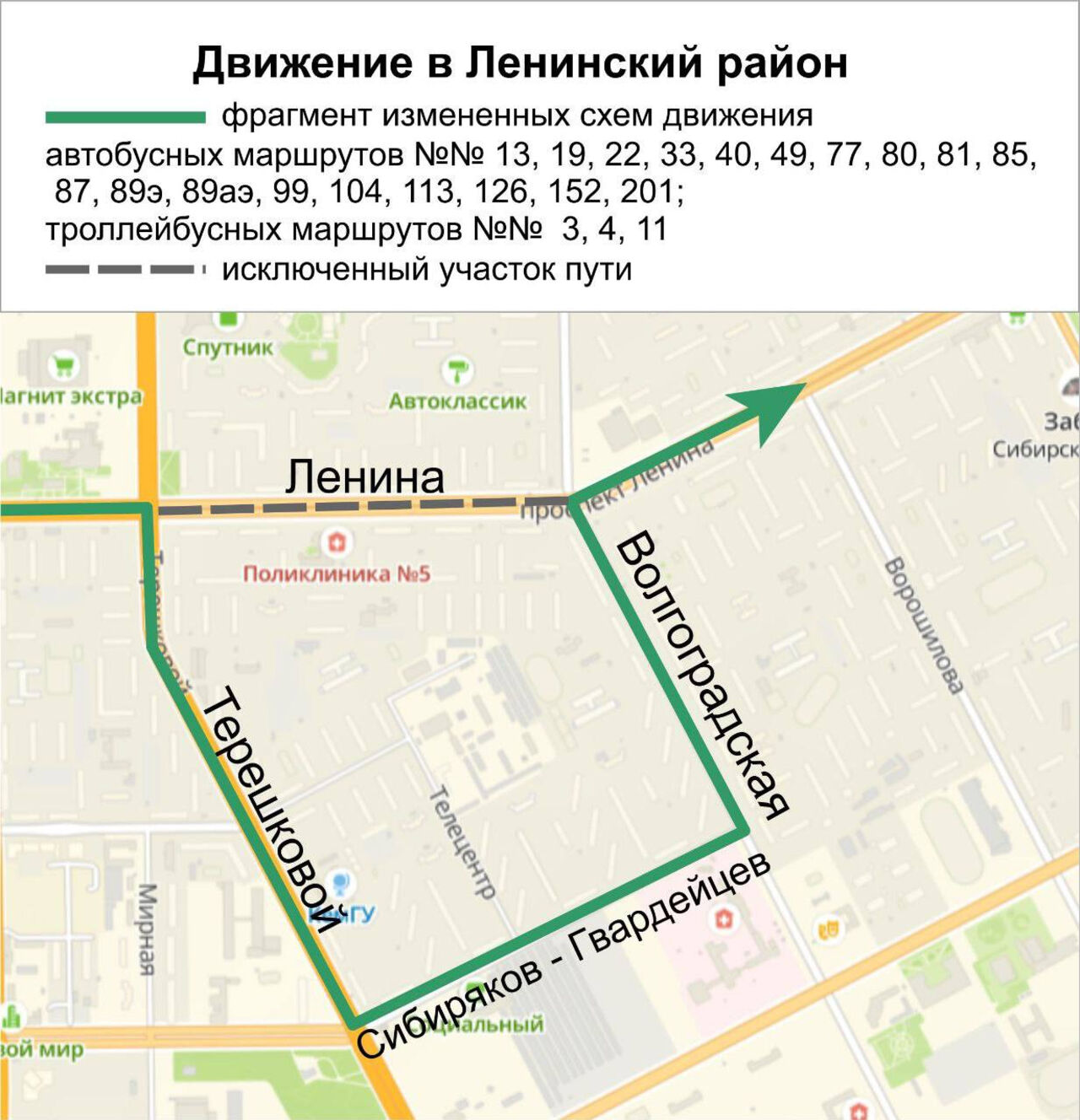 В Ленинский район отправятся автобусы № 13, 19, 22, 33, 40, 49, 77, 80, 81, 85, 87, 89э, 89аэ, 99, 104, 113, 126, 152, 201 и троллейбусы № 3, 4, 11. Маршрут такой: от проспекта Ленина до улицы Терешковой – затем – на улицу Сибиряков-Гвардейцев – после – на улицу Волгоградскую и далее своим маршрутом.