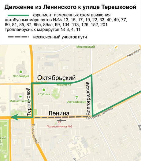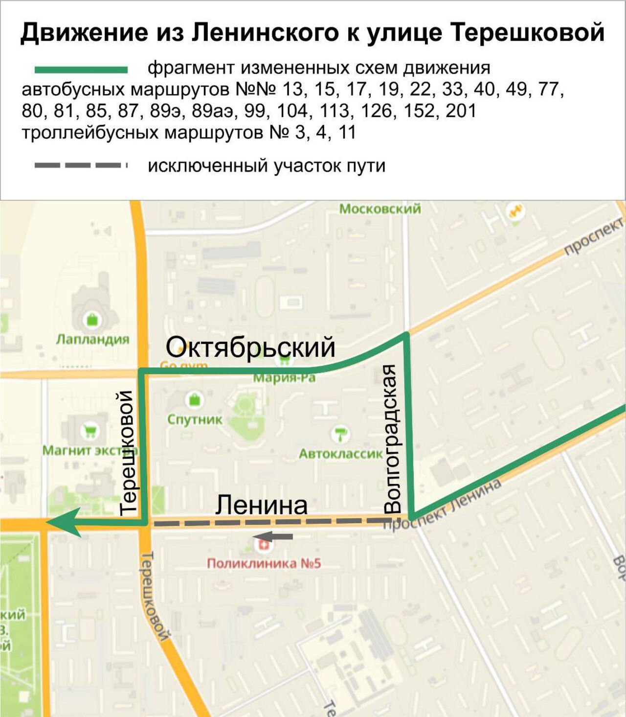 Из Ленинского района к улице Терешковой поедут автобусы № 13, 15, 17, 19, 22, 33, 40, 49, 77, 80, 81, 85, 87, 89э, 89аэ, 99, 104, 113, 126, 152, 201 и троллейбусы № 3, 4, 11. Транспорт проследует по проспекту Ленина до улицы Волгоградской. Затем – на проспект Октябрьский, оттуда – на улицу Терешковой и вновь – по проспекту Ленина далее по маршруту.