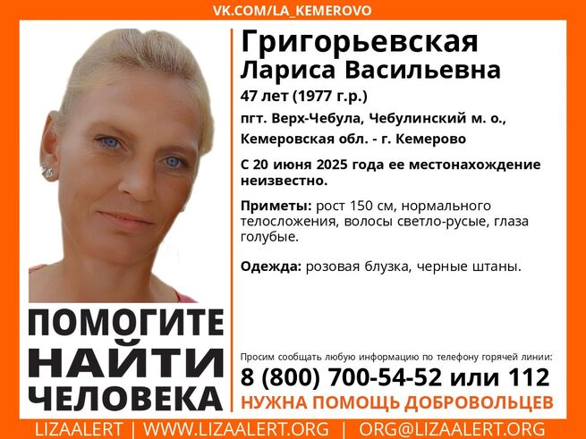 В пгт Верх-Чебула пропала 47-летняя Лариса Григорьевская, сообщает поисковый отряд "ЛизаАлерт" во вторник, 8 июля.