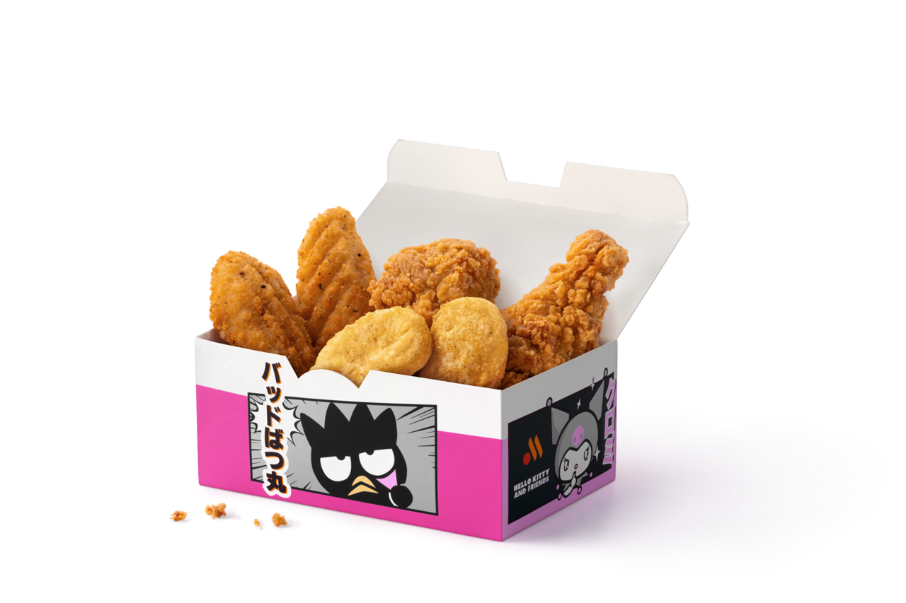 Также, как сообщается на сайте ресторана, будет доступен набор стрипсов и наггетсов – на коробке изображены Kuromi и пингвин Badtz-Maru: это персонажи из вселенной Hello Kitty.