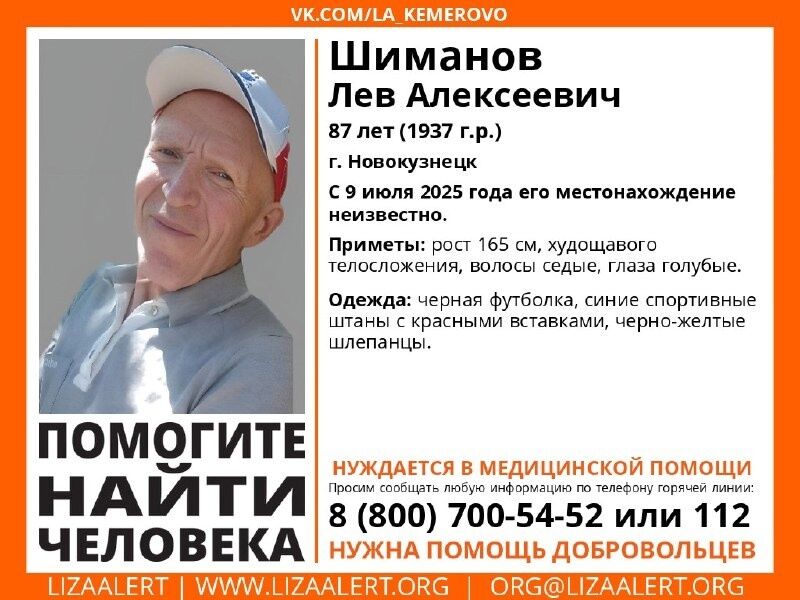 Волонтеры ПСО "ЛизаАлерт" проинформировали, о том, что в Новокузнецке без вести пропал 87-летний Шиманов Лев Алексеевич. С 9 июля информация о его местонахождении остается неизвестной.
