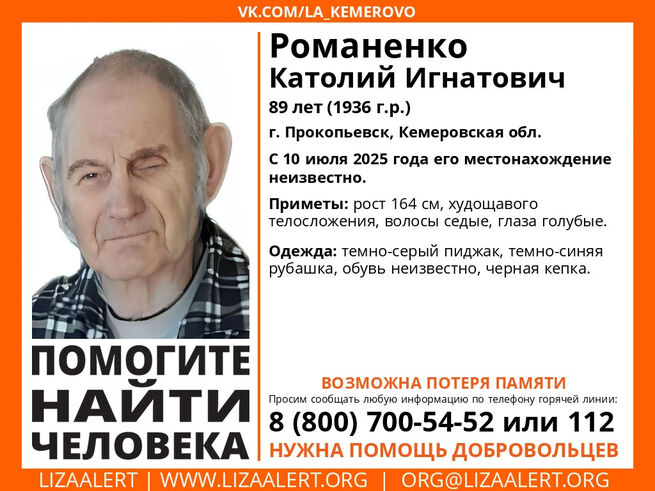 ПСО "ЛизаАлерт" сообщил о пропаже 89-летнего жителя Прокопьевска. Местонахождение Романенко Католия Игнатовича остается неизвестным с четверга, 10 июля.