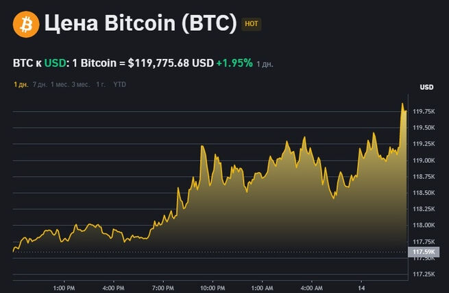 В воскресенье, 13 июля, согласно информации криптовалютной платформы Binance, цена биткоина впервые в истории превысила 119 тысяч долларов.