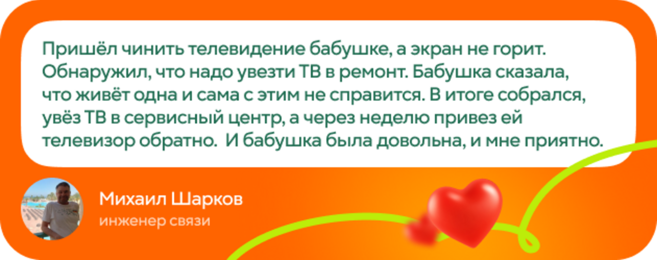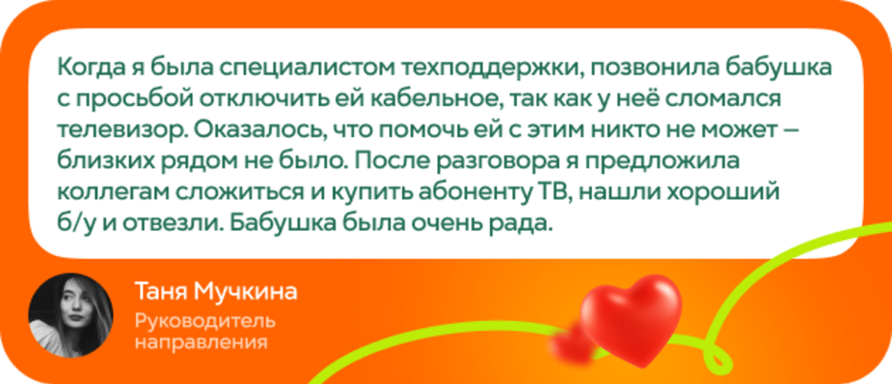 "Вечером к нам зашел дедушка с вопросом по оплате. После решения вопроса он показал книгу о здоровье с QR-кодом на видеоинструкции, но не понимал, как его открыть. Объяснила на словах – он не понял. Тогда мы с коллегой сели за компьютер, сделали пошаговую инструкцию с цветными скриншотами, распечатали. Дедушка ушел счастливый и даже вернулся с благодарственными шоколадками! Видеть его радость – бесценно", – Анна Максичева, менеджер службы поддержки Центра обслуживания.