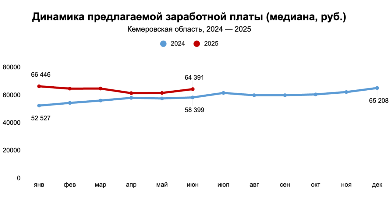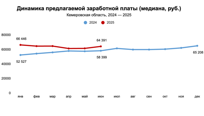 Зарплатные предложения в Кемеровской области за июнь выросли на 9% (5 992 рубля) по сравнению с тем же месяцем 2024 года. При этом сами зарплаты не увеличились, а, наоборот, с января по июнь текущего года они упали на 3% (2 055 рублей).