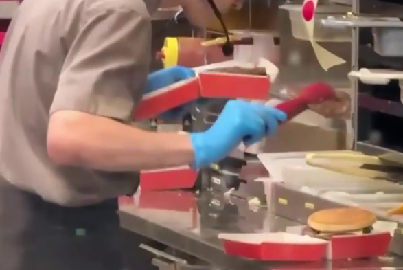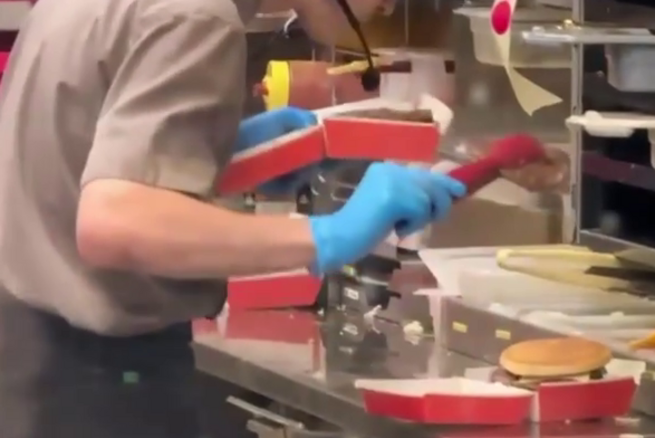 Житель Каменска-Шахтинского снял на камеру процесс приготовления бургера в ресторане "Вкусно – и точка". Один из сотрудников, собирая блюдо, плюнул на котлету.