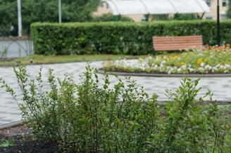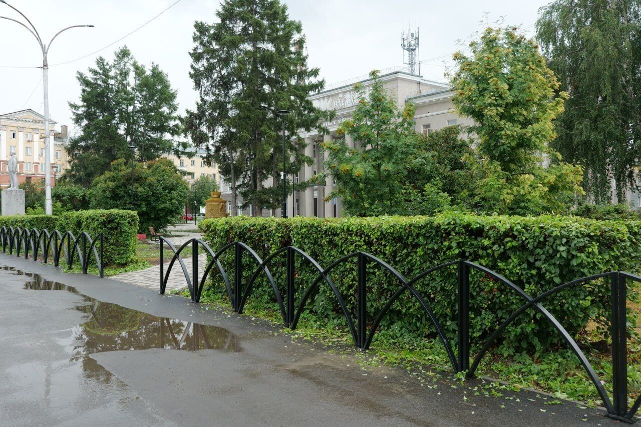 Так, в фасадной части сквера установлены малые архитектурные формы – лавочки с урнами и новое ограждение по периметру.