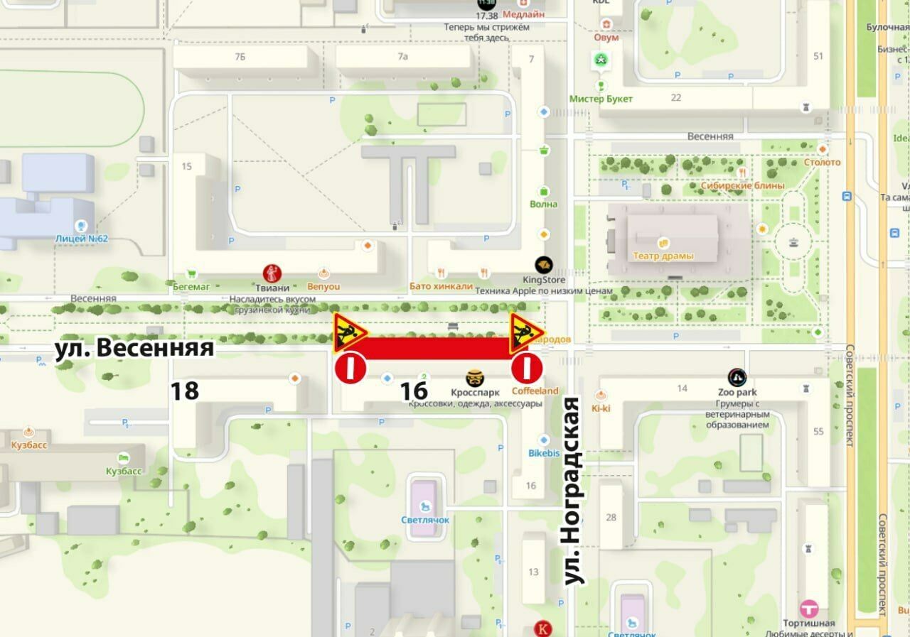 В Кемерове с 8:00 субботы, 19 июля, до 6:00 понедельника, 21 июля, будет закрыто сквозное движение автомобилей на участке улицы Весенней от улицы Красноармейской до улицы Ноградской, предупреждает горадминистрация.