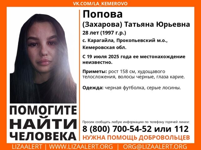 Волонтеры ПСО "ЛизаАлерт" сообщают, что в селе Карагайла, Прокопьевский округ, пропала 28-летняя Попова (Захарова) Татьяна Юрьевна. Местонахождение девушки остается неизвестным с 19 июля.