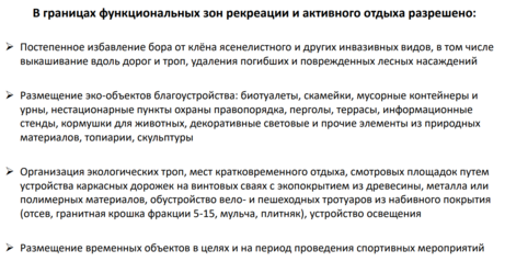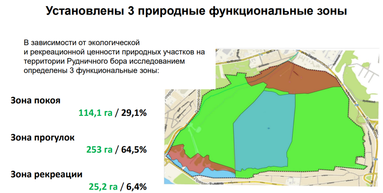 Эта зона составит 29,1% от всей территории бора – центр и южный склон около Правой гавани. Там создается неприкасаемая земля, где нельзя делать вообще ничего. В остальных же зонах допускается благоустройство – деревянные настилы, пандусы, экотропы, причем без асфальта и бетона, а с экологичной гранитной крошкой, рассказали журналистам на брифинге в бору.