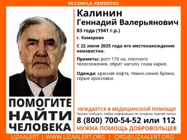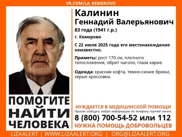 Волонтеры ПСО "ЛизаАлерт" сообщили, что в Кемерове пропал 83-летний Калинин Геннадий Валерьянович. Отмечается, что пенсионер нуждается в медицинской помощи.