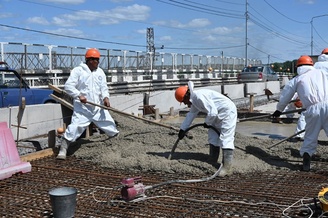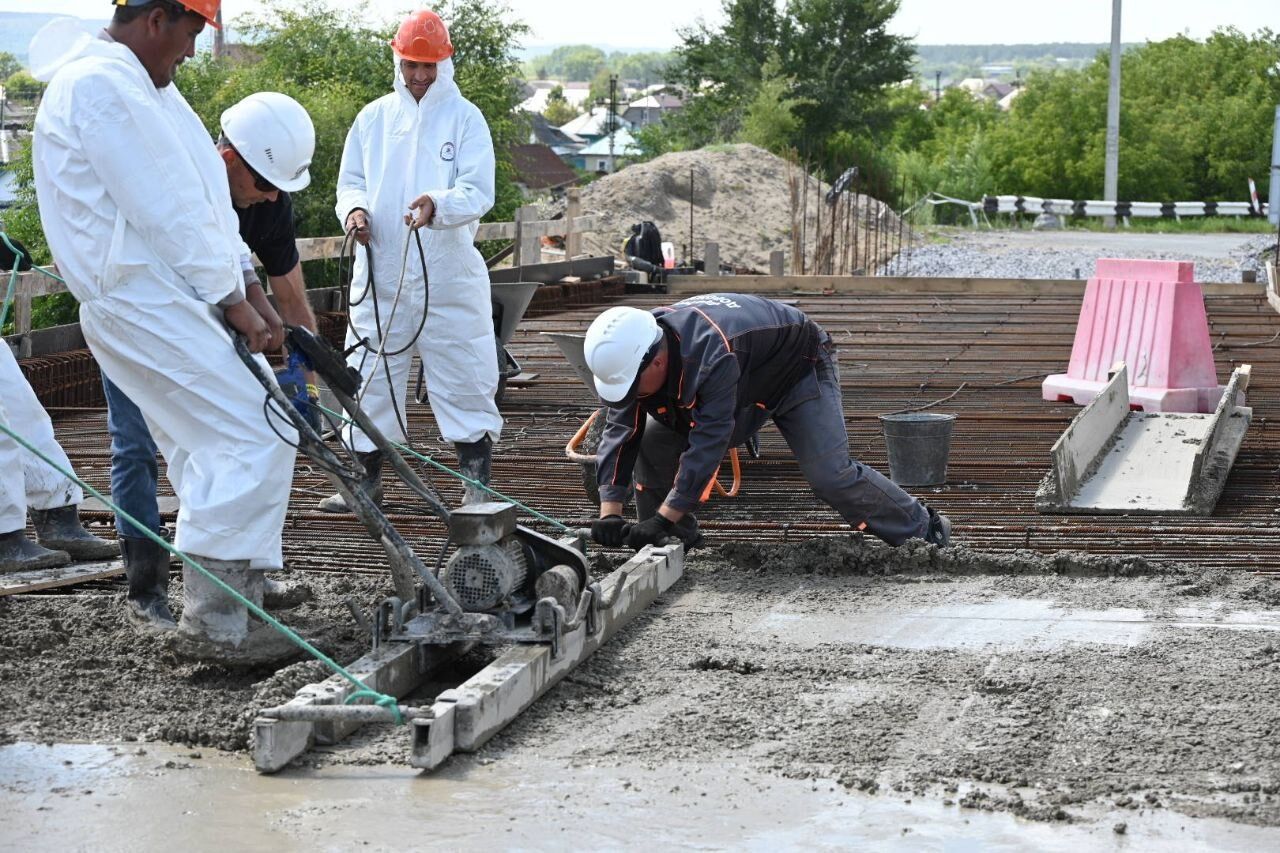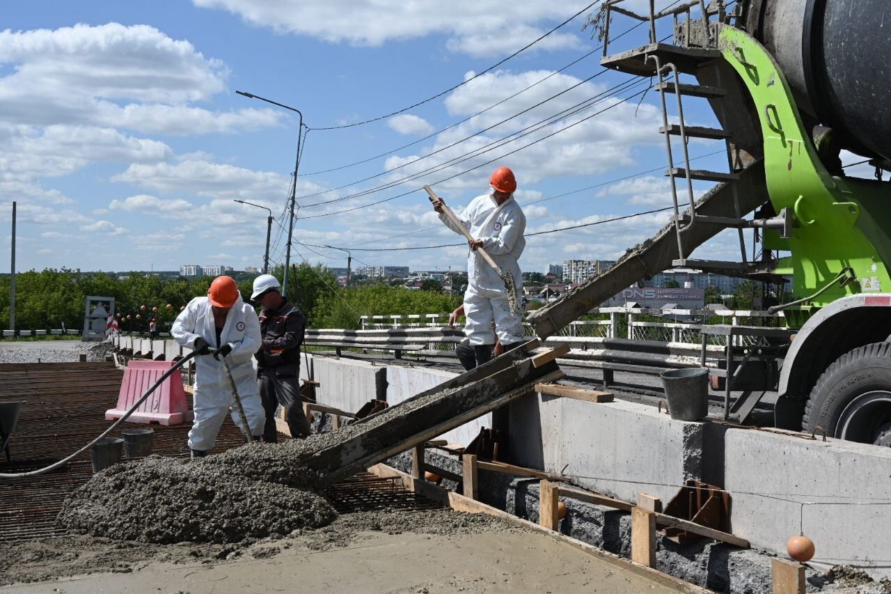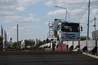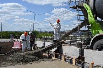 Речь идет о городе Белово. Мэр Сергей Алексеев рассказал, что на путепроводе "Южный" сегодня принимают бетонную смесь для устройства монолитных плит.