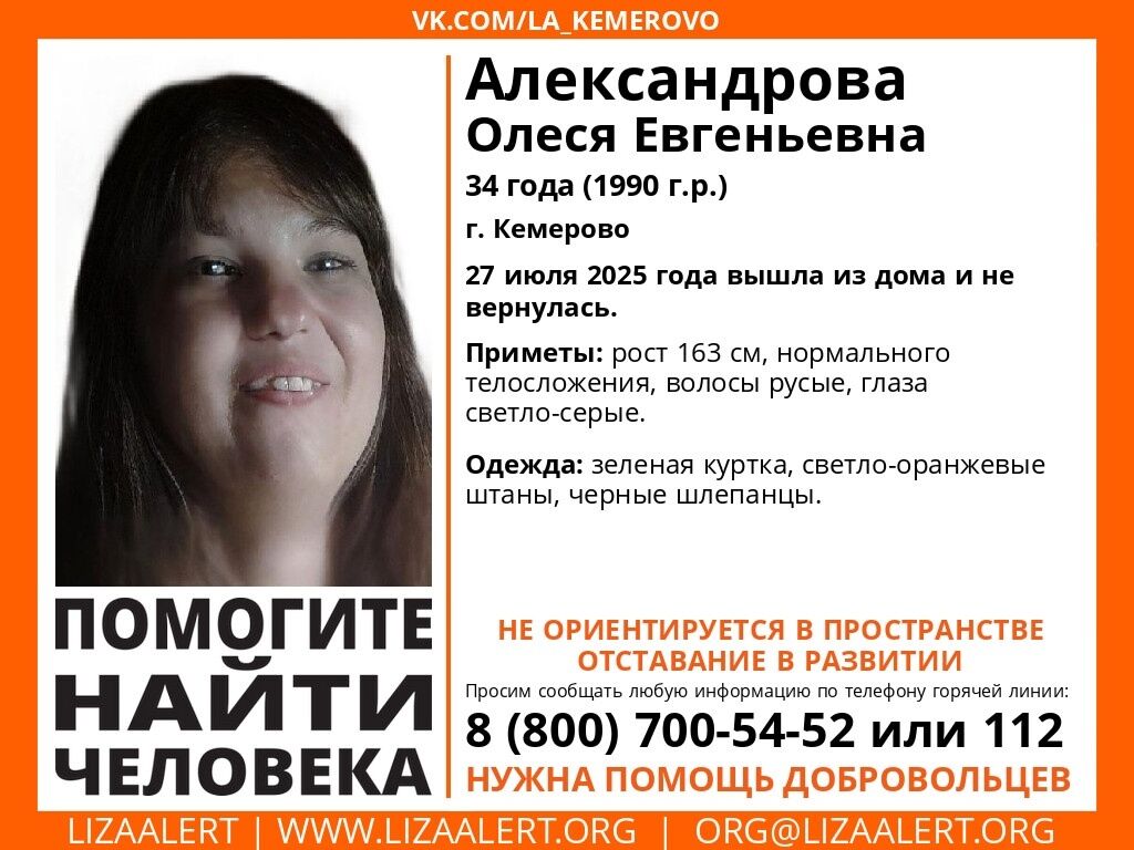 ПСО "ЛизаАлерт" сообщил о пропаже 34-летней жительницы Кемерова. Местонахождение Александровой Олеси Евгеньевны остается неизвестным с воскресенья, 27 июля.