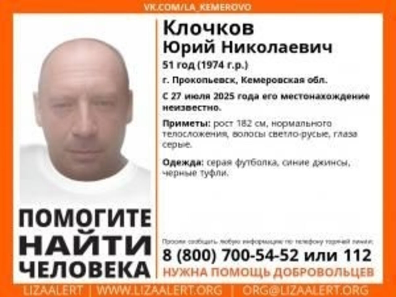 ПСО "ЛизаАлерт" сообщил об исчезновении 51-летнего жителя Прокопьевска. Местонахождение Клочкова Юрия Николаевича неизвестно с 27 июля, родные не могут с ним связаться.