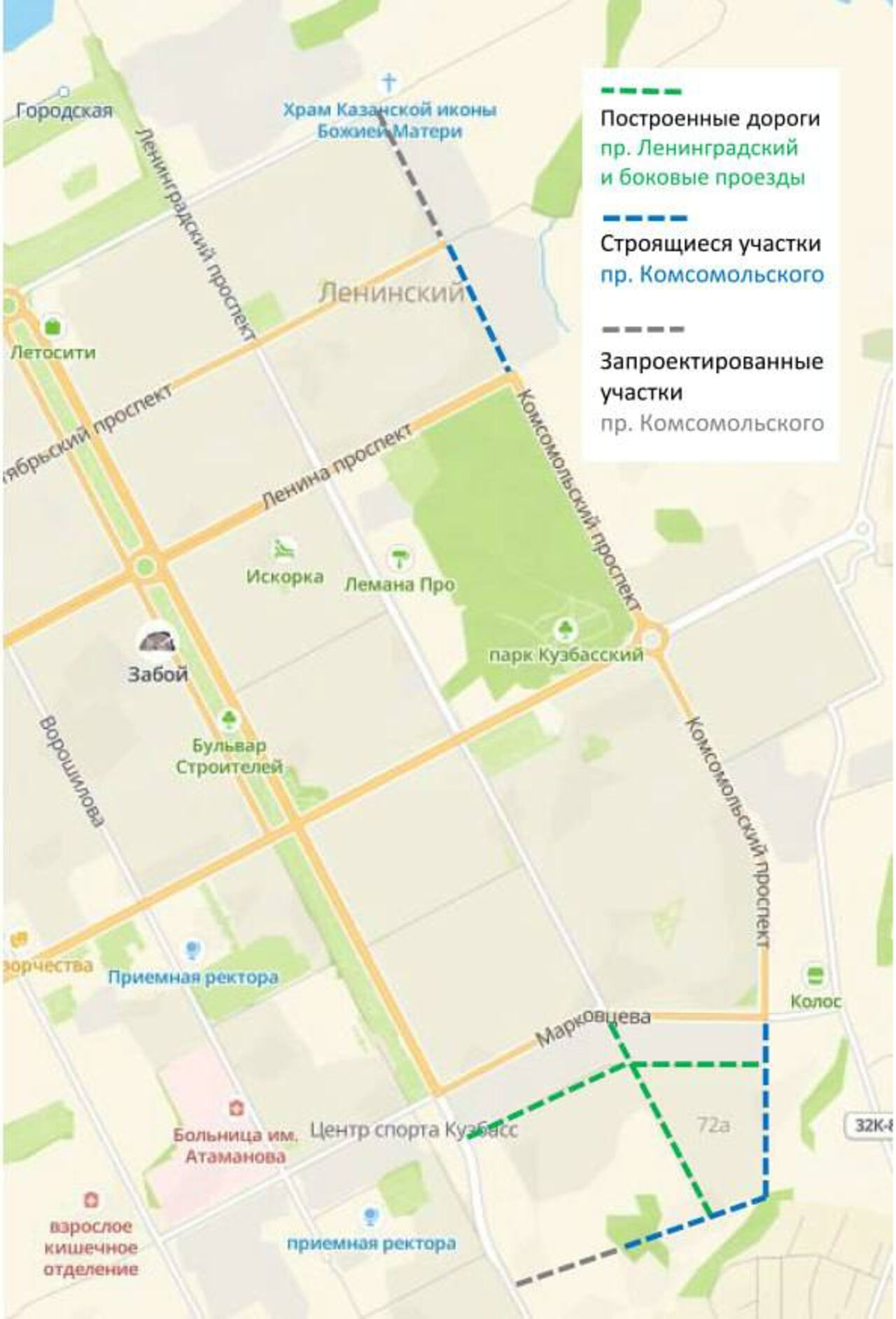 Сам Комсомольский проспект в этой части города только начинает формироваться. В настоящее время ведутся работы на отрезке между Ленинградским проспектом и бульваром Строителей. Эта дорога станет восточным обходом для новых жилых микрорайонов №72 и 72а.