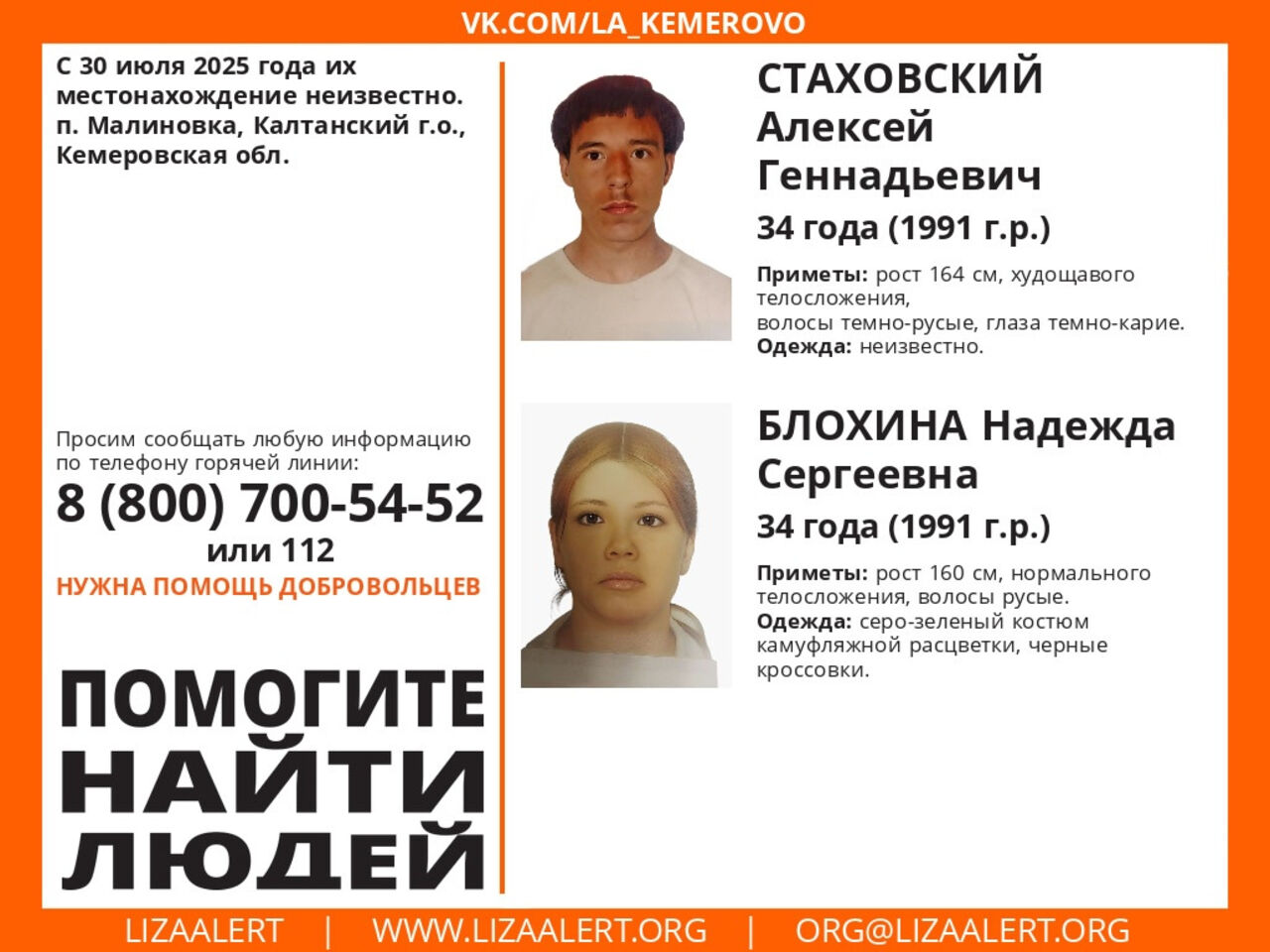 ПСО "ЛизаАлерт" сообщил о пропаже 34-летней Блохиной Надежды Сергеевны и 34-летнего Стаховского Алексея Геннадьевича из калтанского поселка Малиновка. Местоположение мужчины и женщины неизвестно со среды, 30 июля.
