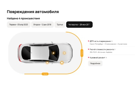 В основе нового дизайна лежит переработанная структура и навигация, данные в отчете представлены в удобной и наглядной форме. Теперь пользователи могут быстро находить нужную информацию благодаря сводке, в которой собрана ключевая информация об автомобиле. Благодаря интеграции нейросети A-Vibe масштабные изменения затронули и блок, содержащий информацию о ДТП и происшествиях: в отчетах появилась единая интерактивная схема повреждений на основе сведений из базы данных ГИБДД, страховых компаний и сервисных центров.