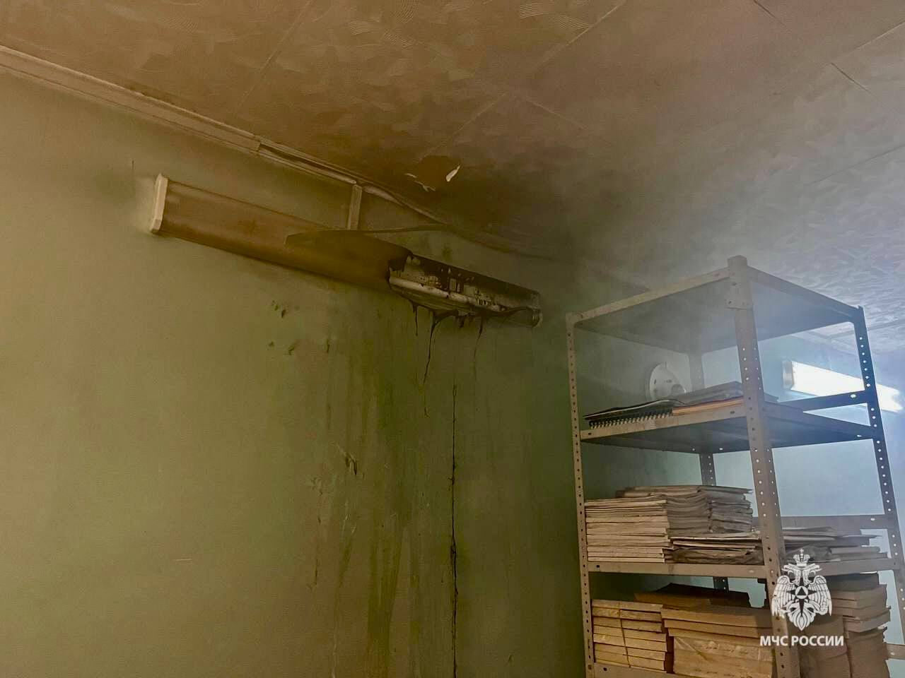 Огнеборцы обнаружили очаг задымления в бытовом помещении. Там они нашли расплавивший светильник и несколько поврежденных книг.
