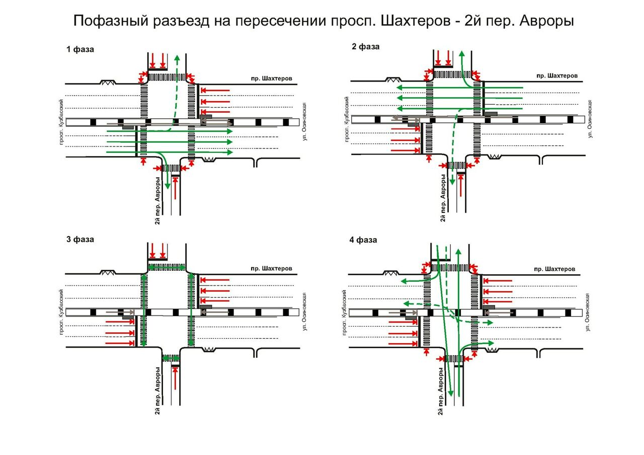Так, на этом участке теперь будут четыре фазы. Первая фаза – движение транспорта по проспекту Шахтеров от проспекта Кузбасского, вторая фаза – по проспекту Шахтеров от улицы Ракитянского, третья – движение пешеходов во всех направлениях, четвертая – движение транспорта по второму переулку Авроры.