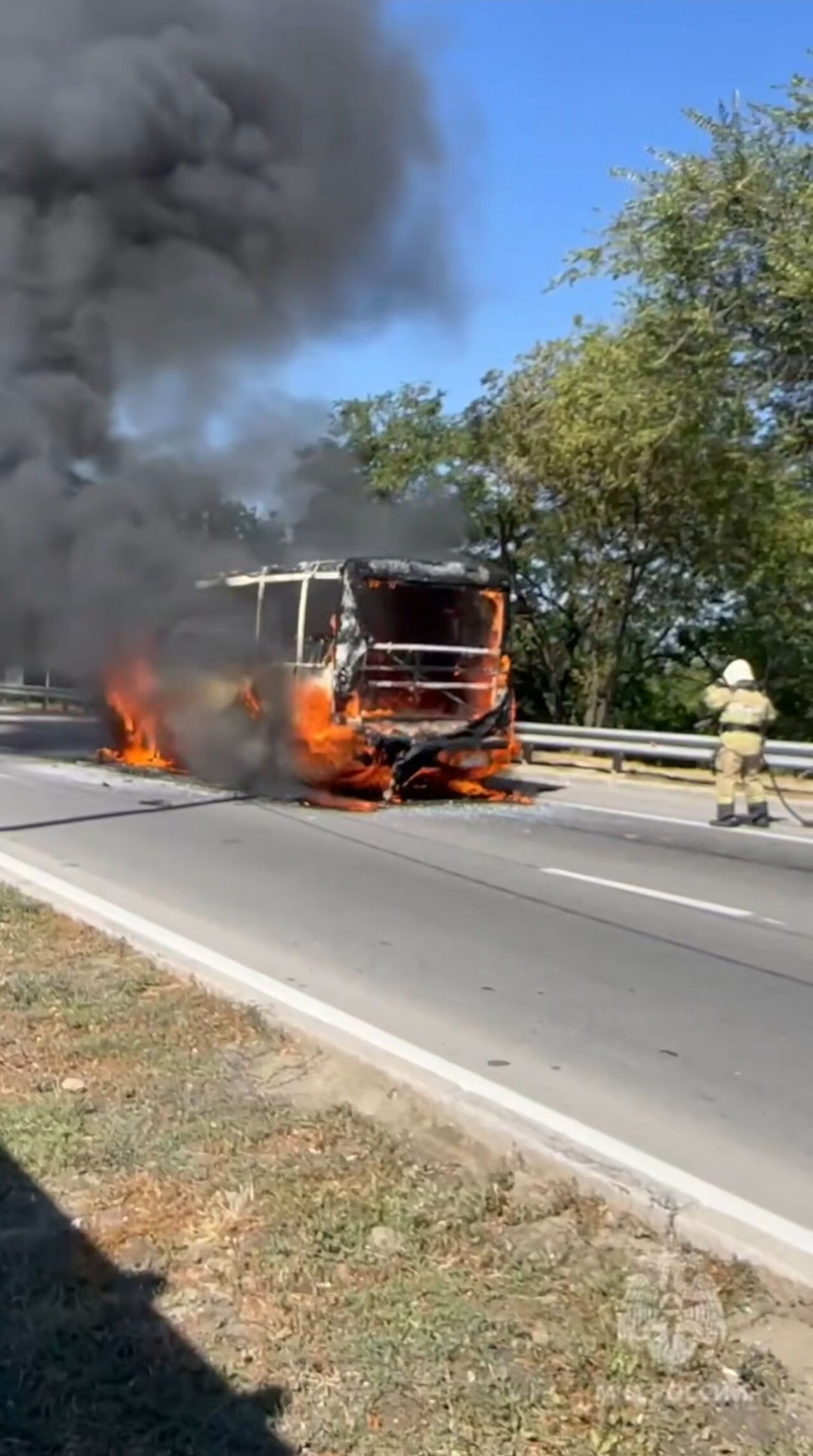 Как рассказали ГУ МЧС России по Республике Крым, на Евпаторийском шоссе загорелся автобус. Пламя распространилось по площади 25 кв. м. На опубликованных ведомством кадрах видно, как огонь полностью охватил общественный транспорт.