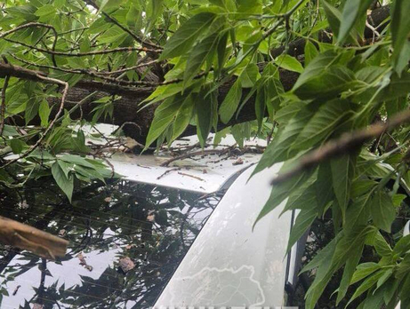 Он также поделился кадрами с последствиями случившегося. На фото видно, что на авто лежат ветки дерева.