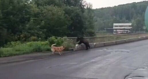 В Междуреченске граждане сняли на камеру, как пес гоняет маленького медведя по мосту.