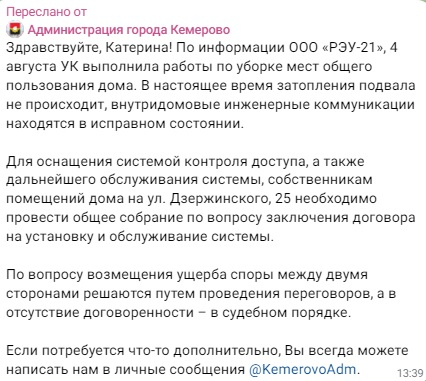 Ранее кемеровчанка писала в тг-канал губернатору и рассказывала о своей проблеме. В пятницу, 8 августа, пришел ответ от городской администрации: