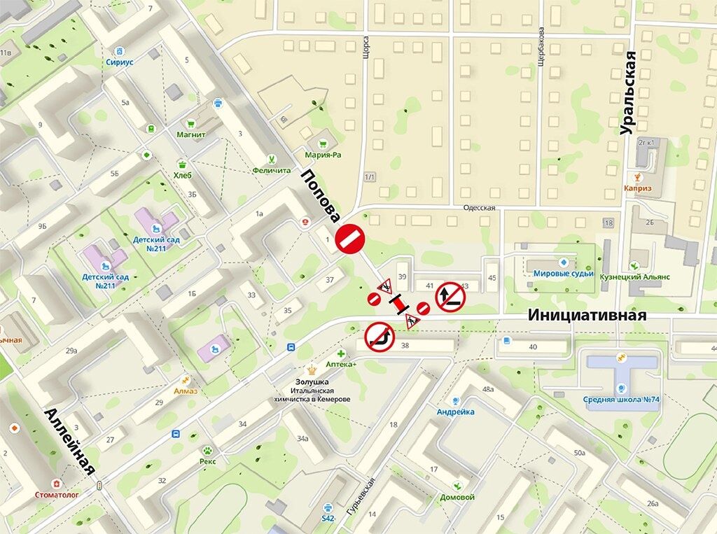 Как сообщили в администрации Кемерова, с 08:00 16 августа до 21:00 20 августа будет закрыто автомобильное движение на участке улицы Попова в районе примыкания к улице Инициативной.