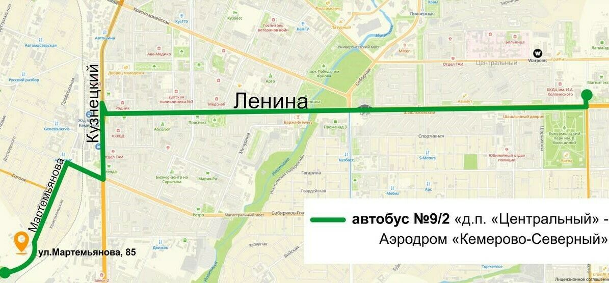 Так, маршрут № 9/2 "Д/п Центральный – Аэродром "Кемерово-Северный" поедет через д/п Центральный, проспект Ленина, проспект Кузнецкий, улицу Февральскую, улицу Мартемьянова.