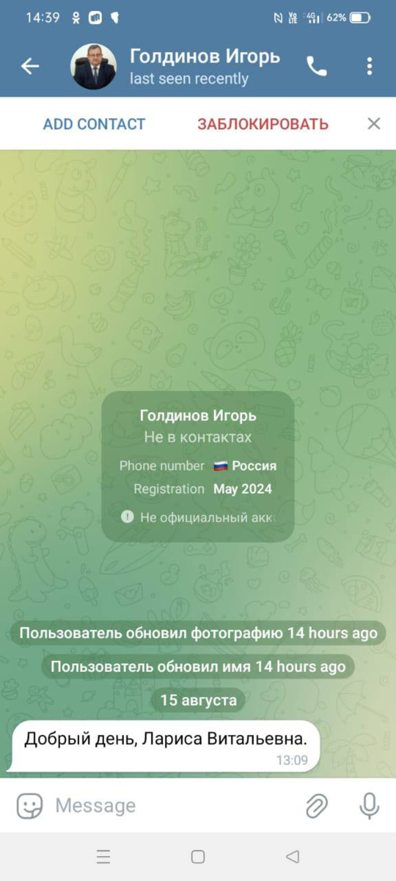Неизвестные создали поддельный Telegram-аккаунт мэра Калтана Игоря Голдинова, предупреждает настоящий Голдинов в подлинном канале.