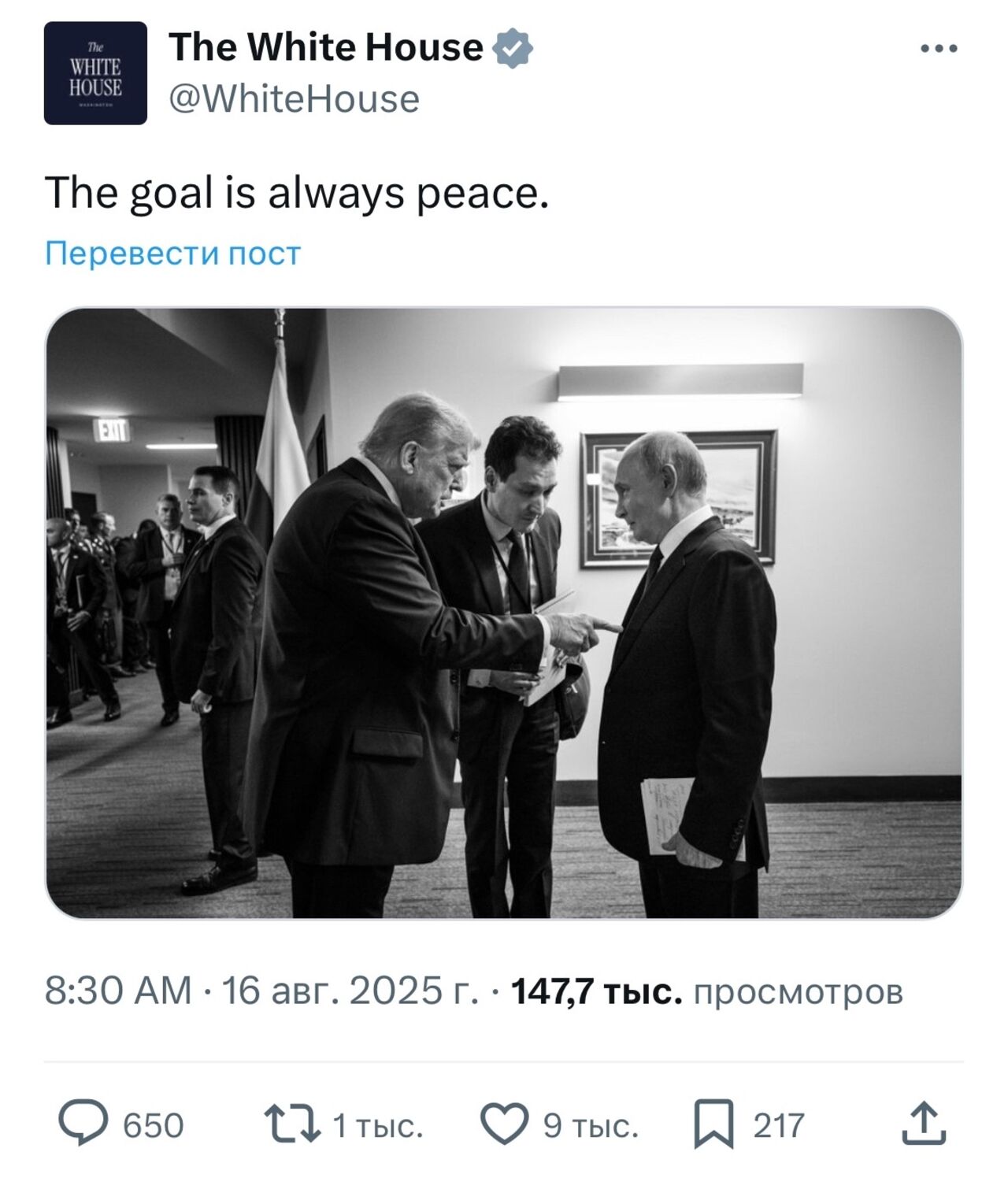 Белый дом опубликовал в соцсети Х фотографию, на которой оказались запечатлены президент РФ Владимир Путин и американский лидер Дональд Трамп. Кроме того, на фото попал и переводчик, пишет РИА "Новости".