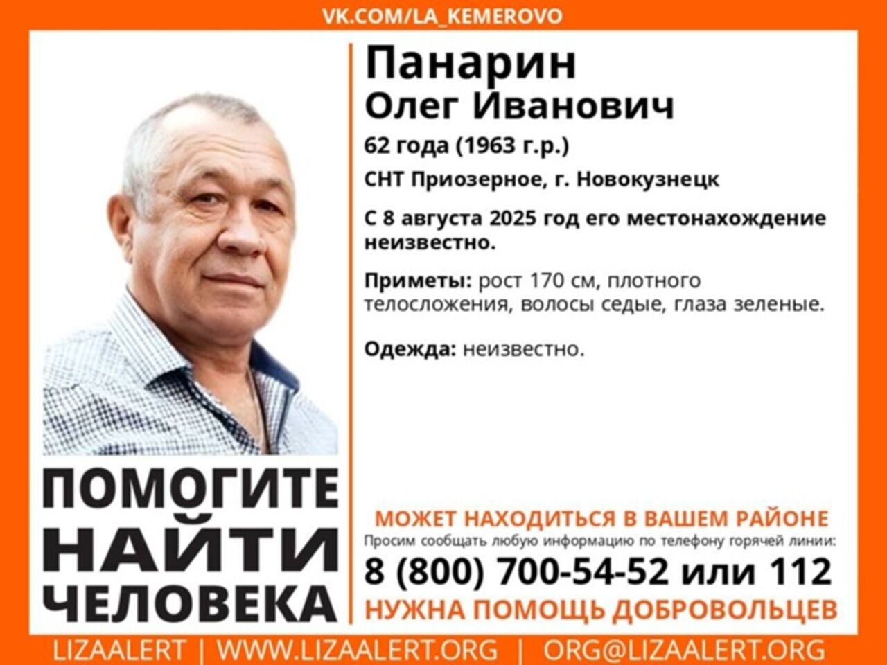 Волонтеры ПСО "ЛизаАлерт" сообщили, что в СНТ Приозерное, Новокузнецк, пропал 62-летний Панарин Олег Иванович. Его местонахождение остается неизвестным с 8 августа.